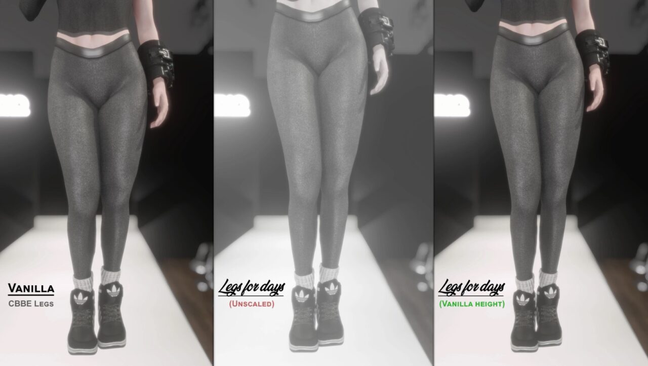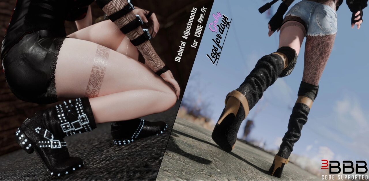 Мод делает движения персонажей более плавными и естественными, особенно в анимациях скрытности и при ношении каблуков. Варианты Type 1 и Type 2 позволяют адаптировать мод под разные пресеты CBBE, а Knee Fix Any через SSF обеспечивает гибкость для любых совместимых скелетов. Вариант Legs For Days добавляет удлинённые ноги, создавая элегантный силуэт без изменения роста персонажа.